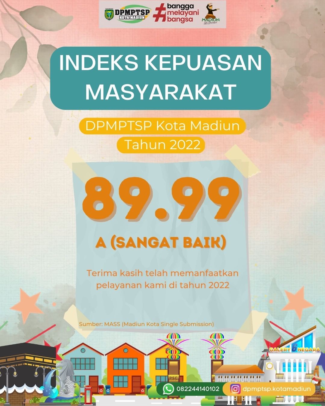 Berikut hasil Indeks Kepuasan Masyarakat (IKM) terhadap DPMPTSP Kota Madiun Tahun 2022 (1 Januari 2022 – 31 Desember 2022)